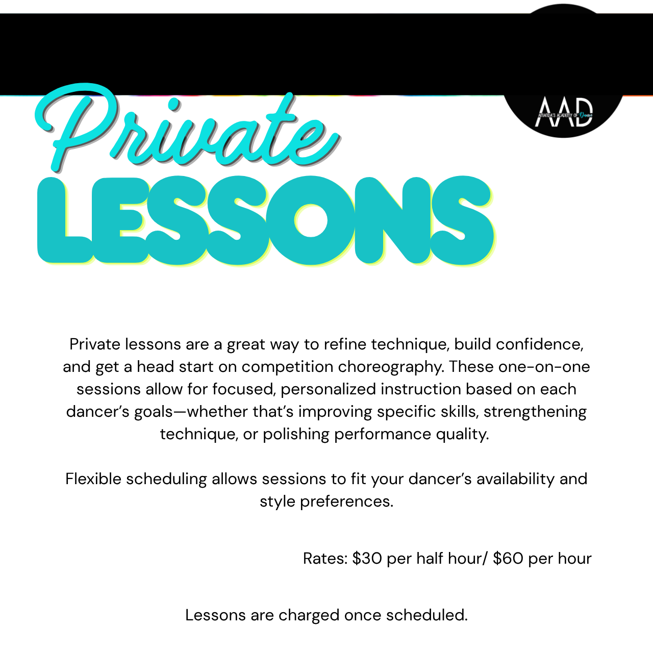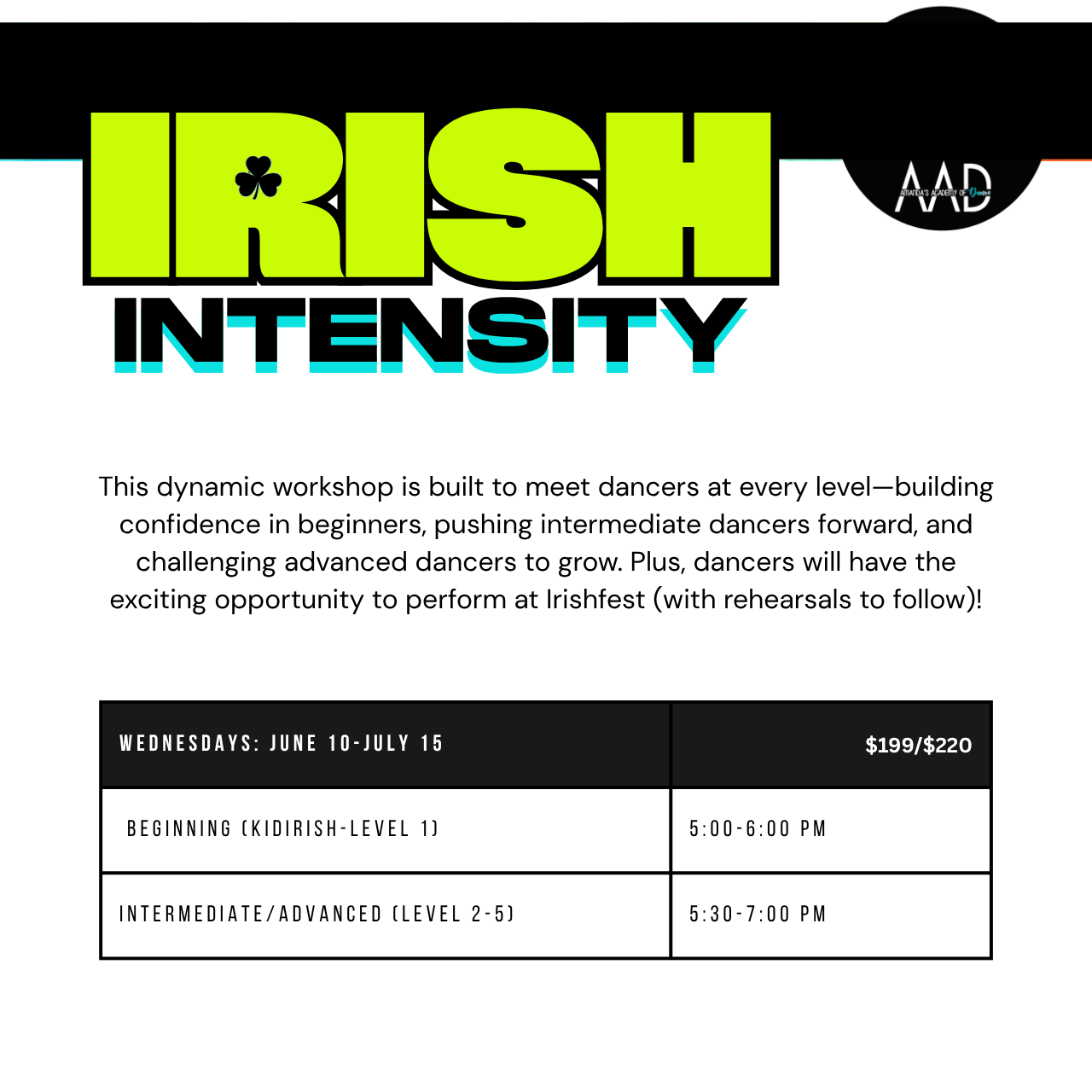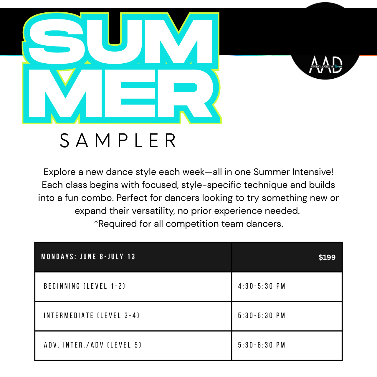 - Dancers will be supervised at all times by fully qualified AAD instructors in a safe, fun and comfortable environment!