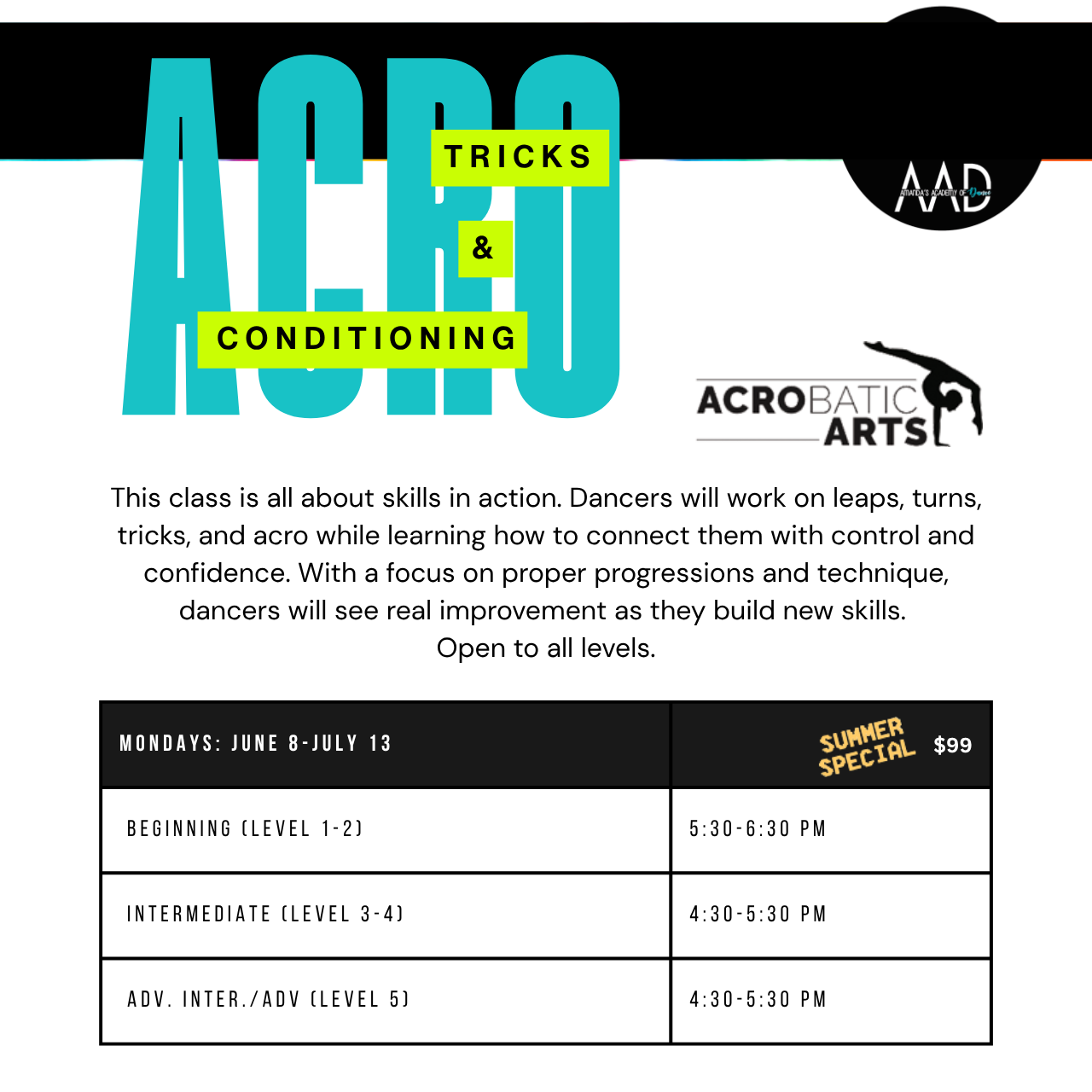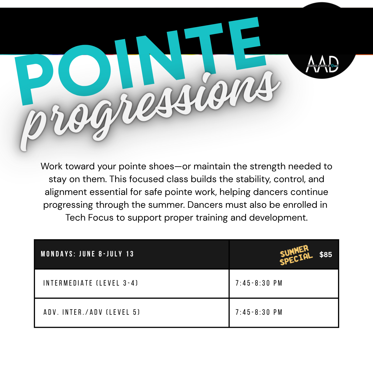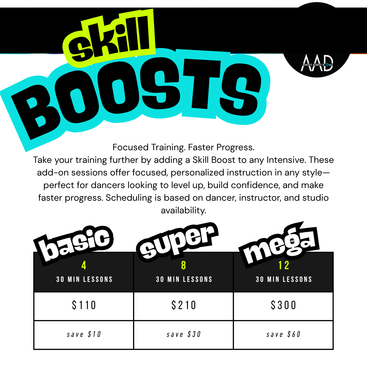 - Dancers will be supervised at all times by fully qualified AAD instructors in a safe, fun and comfortable environment!