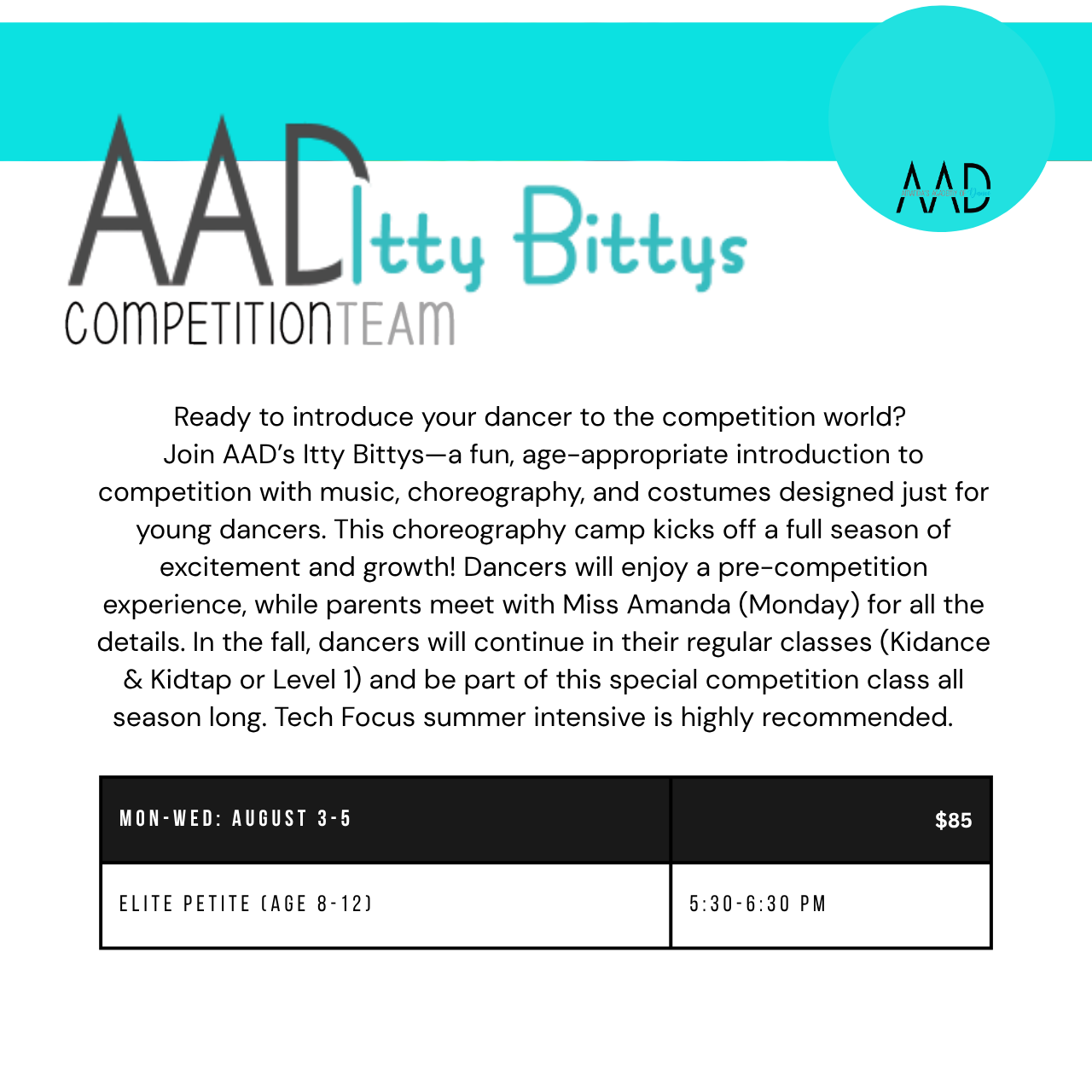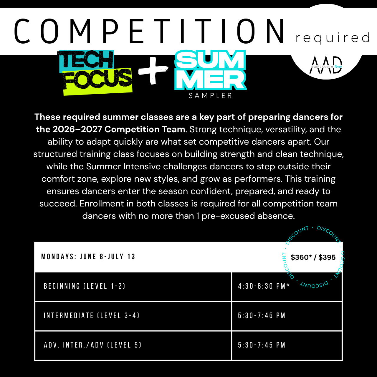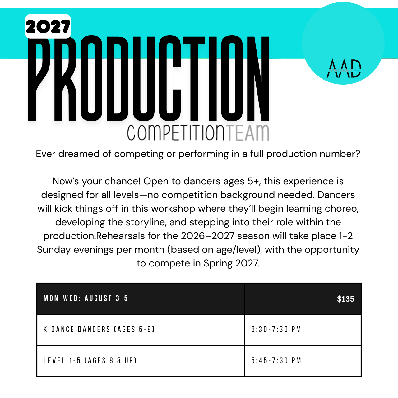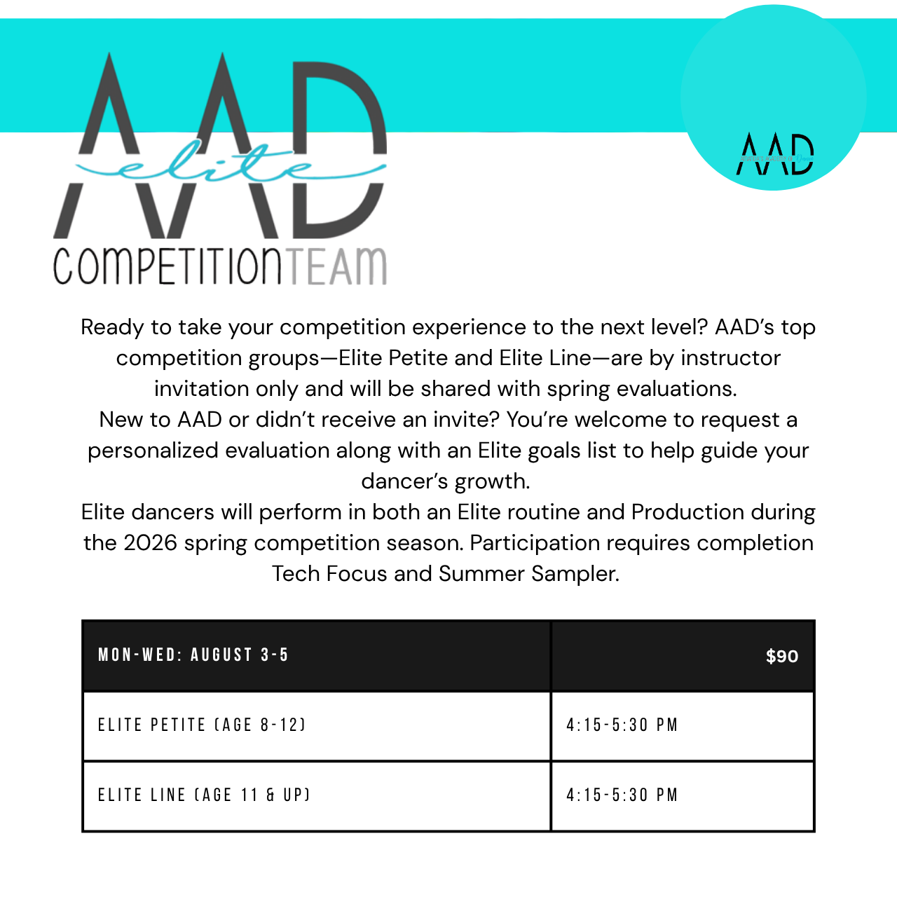 - Elite Groups, Production & AAD Itty Bittys will also require a costume, fall/spring rehearsals and competition fees will apply. Participants must plan to enroll in fall classes to participate. Dancers must meet registration requirements to compete during the 2027 competition season.
